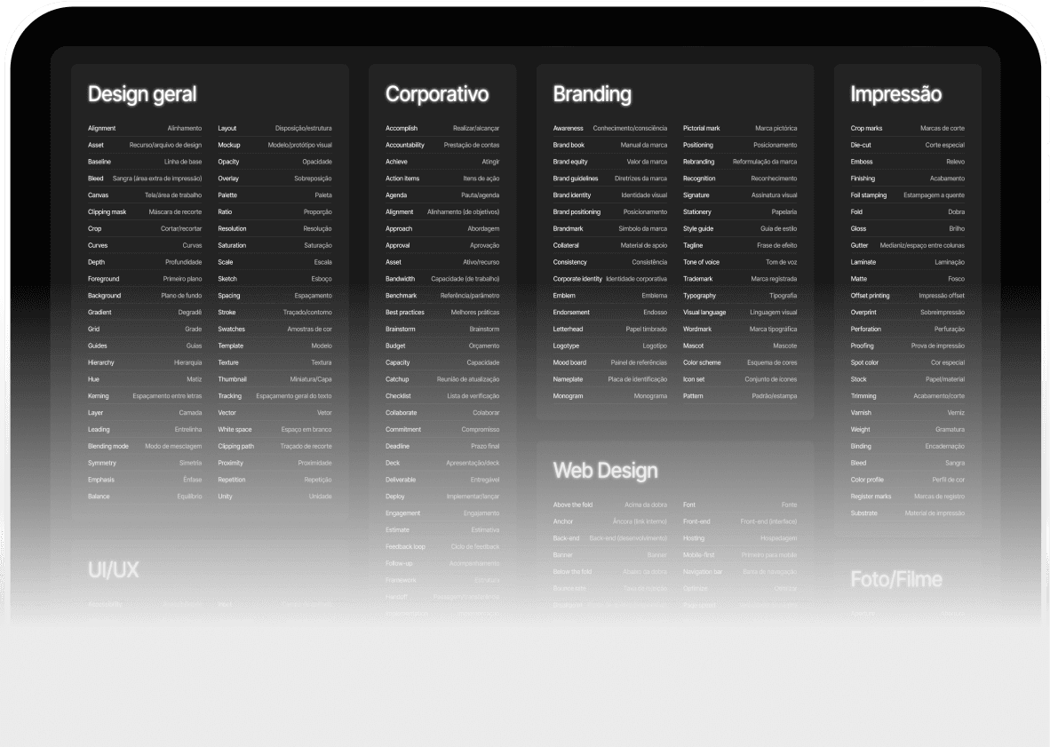 Glossário completo com 345 termos essenciais em inglês para designers se comunicarem profissionalmente com clientes internacionais.